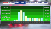 By Saturday, another cold front is expected to sweep through, bringing another round of rain chances—particularly in northwestern areas where precipitation probabilities are around 50 percent. Southeastern areas will see lower chances near 25 to 30 percent.
