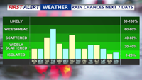 Expect showers to be more widespread through Tuesday night and linger into Wednesday. While the rain will be generally light, periods of moderate to heavy showers may occur. Rainfall totals from Monday night through Wednesday are expected to reach between a half inch to an inch, with locally higher amounts possible. The National Weather Service has issued a Marginal Risk (Level 1 of 4) for excessive rainfall, but flooding concerns remain low.
