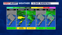 Wednesday looks like a washout for Sussex County. Steady rain, embedded showers, and the possibility of a few thunderstorms will persist throughout the day. Rainfall totals could be significant—potentially a half-inch to three-quarters of an inch—with locally heavier amounts possible in storms. Skies will stay cloudy, and with the lack of sunshine, highs will struggle to get out of the 60s.