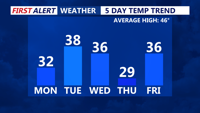 Getting at or slightly above freezing today, mildest day of the week will be Tuesday as temperatures approach 40 degrees.