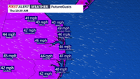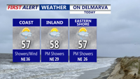 By Wednesday, the coastal system will linger off the North Carolina and Virginia coasts while another stronger low approaches from the west. Winds will remain brisk out of the northeast at 25 to 35 mph along the coast, with gusts of 20 to 30 mph inland. Temperatures will again climb into the upper 50s and low 60s under mostly cloudy skies and isolated showers.