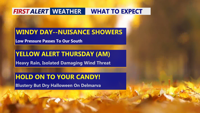 Rain tapers off Thursday night as the system exits and a cold front sweeps through. Behind it, winds will strengthen for the trick or treaters on Halloween, with gusts up to 40 mph and highs in the upper 50s to low 60s.
