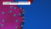 Heat indices between 100 to 104 on Saturday away from the coast.
