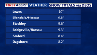 The heaviest snowfall was recorded in Georgetown, Seaford, and areas near Delaware Coastal Airport, each reporting an impressive 12 inches of accumulation. Other areas, such as Milton, Lewes, and Harbeson, also saw totals exceeding 10 inches, while locations like Delmar and Selbyville experienced between 6 and 8 inches.