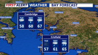 DELMARVA - A strong area of high pressure centered to the north will maintain dry, settled weather across Sussex County into Monday evening. Skies will be mainly clear to partly cloudy, with northeast winds around 5–10 mph. Highs are expected to reach about 60 °F.