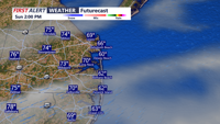 By Monday, high pressure is forecast to build in from the west, delivering drier and warmer weather. Temperatures will rise, though light winds could allow for a sea breeze during the afternoon. Highs will be into the 70s, with cooler readings at the beaches.