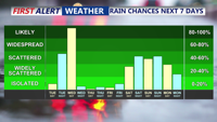No severe weather is expected, but thunder and occasional gusty winds cannot be ruled out overnight. Lows will stay relatively mild — in the low 60s — ahead of the front.