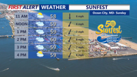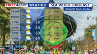 The rest of Sunday will bring more tranquil conditions, though skies may turn partly to mostly cloudy at times. Highs will remain in the upper 50s to around 60 degrees. Looking great for Sea Witch and Sunfest. Sunday night lows will dip into the low and mid 40s.