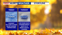 Two systems will impact the region, one Tue-Wed brining showers/drizzle and windy conditions, the next Wed PM-Thu, bringing heavier rain wind and possible thunder.