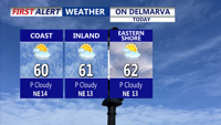 DELMARVA -- An expansive area of high pressure centered to the north will continue to dominate Delmarva’s weather through Monday, bringing dry conditions and partly cloudy skies, more clouds southern reaches of the peninsula. The beaches will experience gusty northeast winds up to 25 mph, while inland temperatures will stay mild, reaching the upper 50s to low 60s.