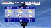 DELMARVA -- Seasonable temperatures return to Delmarva under a mix of sun and clouds, with highs reaching the low to mid 50s. A southeast breeze at 10 to 20 mph will keep the air feeling a bit cool, while high pressure parked off the Northeast coast remains in control through the day.