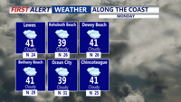 Low pressure is tracking through the Carolinas, then eventually off the mid-Atlantic coast early Monday morning. A solid .50" to 1" of rain has fallen across Delmarva since Sunday afternoon. The rain ends very early Monday morning, but watch for wet roads and large puddles, especially in low lying and poor drainage areas. Temperatures will remain just above the freezing mark, so icy conditions are expected. But use extra caution on the way to work and school Monday morning. The rest of Presidents' Day is looking breezy and chilly with highs in the low to mid 40s under mostly cloudy skies. It will feel like 20s and 30s with the wind.