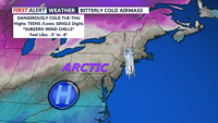 The arctic air mass will persist into Tuesday and Wednesday, with temperatures remaining well below normal. Lows will be in the single digits, and wind chills will stay dangerously low below zero. A slight chance of snow is possible late Tuesday into Wednesday as a low-pressure system brushes the area, but significant impacts are uncertain at this time.