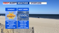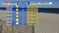 Sunday’s weather will be a standout, with abundant sunshine across the region. Inland temperatures are forecast to reach between 75 and 81 degrees, while coastal areas will see highs ranging from 72 to 77. It will be breezy, with west winds gusting between 25 and 35 mph during the afternoon.