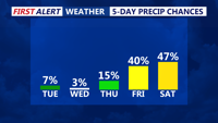 By Tuesday, cooler and drier air settles in, with high temperatures expected in the mid to upper 50s. Breezy northwest winds will gust up to 25 mph through the day. Skies will remain sunny, but it’ll feel noticeably cooler compared to Monday.