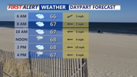 DELMARVA -- Another warm and humid evening Saturday as low clouds, patchy fog, and stratus clouds develop under a northeast to east flow. Overnight lows will settle in the mid-60s.