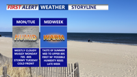 Mostly cloudy humid Monday, stormy Tuesday, before summer-like weather builds in mid to late week.