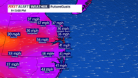 After early rain and mild conditions this morning, skies are expected to clear as winds increase sharply behind the front. West to northwest winds will strengthen through the afternoon and evening, with sustained speeds of 20 to 30 mph and gusts between 35 and 45 mph. Isolated gusts could reach 50 mph, especially in open and coastal areas. A Wind Advisory remains in effect until 1 a.m.