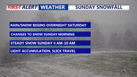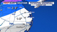Conditions change late Saturday night into Sunday morning as an arctic front sweeps across Delmarva, bringing a quick-moving snow event. YELLOW ALERT Sunday morning. Current forecasts call for widespread snowfall totals of 1 to 3 inches, with localized amounts up to 4 inches possible, primarily north of Kent County, DE. Around 1-2 inches from Lewes, down the Delaware coast into Ocean City, MD. Some areas could briefly see rain or a rain-snow mix before changing to all snow.