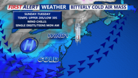 Snow tapers Sunday as arctic air pours in on gusty west to northwest winds. Temperatures may struggle to rise during the day and could even fall by afternoon, leading to dangerous wind chills and areas of blowing snow. Sunday night lows drop into the teens, with wind chills falling into the single digits.
