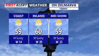 DELMARVA -- Plenty of sunshine will brighten Delmarva today, but a steady west-northwest breeze will keep the air feeling crisp. Afternoon temperatures will climb into the upper 50s to near 60 degrees, while wind gusts of 20 to 25 mph add an extra chill across the peninsula.