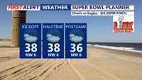 A sunny but blustery Super Bowl Sunday, with highs reaching the mid to upper 40s and gusty northwest winds between 30 and 35 mph. High pressure will build in from the west overnight, bringing dry conditions and lighter winds for Monday, though temperatures will remain chilly, topping out in the mid-30s to low 40s. Overnight lows will dip into the upper 20s.