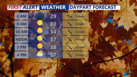 Saturday morning will bring milder conditions as high pressure shifts southward, introducing a gradual warming trend. Daytime highs will reach the mid-40s, with calm winds and plenty of sunshine. The region will enjoy fair weather through the weekend.