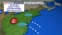 A cut off area of low pressure will develop to our west keeping rain chances going into the early to middle part of next week. It won't be raining all the time. Some of the rain could be heavy at times with some thunder possible too. Some areas will pick up in excess of 1 inch of rain. Temperatures will be in the 70s with lows in the 50s.