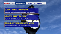 YELLOW ALERT DAY--The rain will be heavy at times through Tuesday morning and afternoon, with onshore flow bringing moisture off the ocean. Highs rise into the upper 40s to low 50s across the Peninsula.