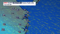 Strong west winds will develop behind the front, with gusts between 40 and 50 mph possible. A Wind Advisory is in effect through 1 p.m. Tuesday for Delaware and continues until 10 p.m. this evening for Maryland counties on Delmarva. Gusty conditions will persist through the night, with temperatures dropping into the upper 20s to low 30s.